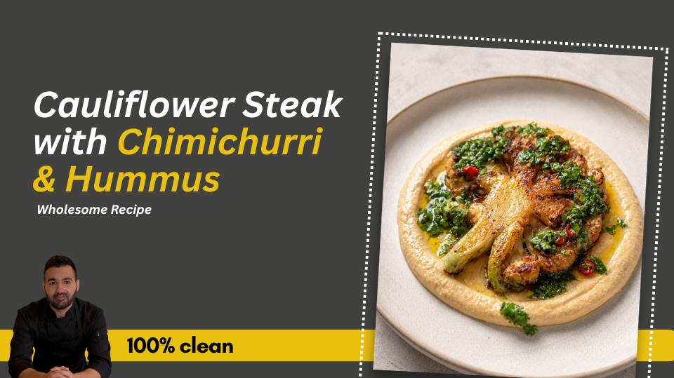 A golden cauliflower steak, draped in punchy green chimichurri, resting on a cloud of silky hummus. This one turns heads. And it takes less than 30 minutes.